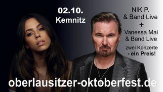 Am Montag, den 2.10.23 folgt ein Mega Abend. 2 volle Livekonzerte an einem Abend, zu einem Preis! Wir freuen uns NIK P, nach seinem Oktoberfestdebüt letztes Jahr, auch dieses Jahr wieder in Kemnitz begrüßen zu dürfen. Zusammen mit seiner Band hat er letztes Jahr das Zelt gerockt und wird daran dieses Jahr bei seinem zweiten Livekonzert in Kemnitz anknüpfen. Anschließend dürfen wir gemeinsam an diesem Abend Vanessa Mai & Band zum ersten Mal auf der Bühne des Oberlausitzer Oktoberfestes begrüßen. Sie ist eine Vollblut-Entertainerin und Multitalent. Sängerin, Schauspielerin, Tänzerin und Social-Media Star, all das vereint Vanessa Mai in Ihrer Person und Sie wird ein außergewöhnliches Livekonzert in Kemnitz darbieten. Wir freuen uns auf einen Mega Abend mit toller Musik und außergewöhnlichen Künstlern!