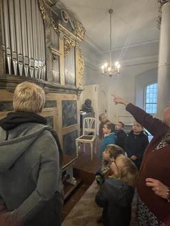 Jedes Mal, wenn wir in die Turnhalle gelaufen sind, sahen wir den Turm mit dem goldenen Stern und der Wunsch war geweckt, dort mal hinein zu gehen. Wir waren ganz aufgeregt, als wir endlich davorstanden und uns Frau Bickhardt-Schulz begrüßte. In der Kirche war es angenehm warm und wir setzten uns und schauten uns in Ruhe um. Es gab soviel zu entdecken. Die Pfarrerin hatte eine Geschichte für uns vorbereitet und mit uns gesungen – das war toll. Danach konnten wir wirklich jeden Winkel erkunden. Sogar die große Orgel haben wir uns von der Nähe angesehen. Manche Kinder waren schon zur Taufe ihrer Geschwister hier und so konnten auch die Kinder etwas erzählen. Das war ein tolles Erlebnis.