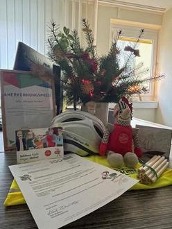 In diesem Zusammenhang erhielten wir am Montag, den 09.12.2024, einen Anerkennungspreis. Dieser umfasste eine Urkunde, Fahrradhelme für die Kita, eine kostenfreie Veranstaltung zum Thema „Sicherheit“ bei der Verkehrswacht Sachsen e.V. sowie Buntstifte, Ausmalbücher und ein Plüschtier.