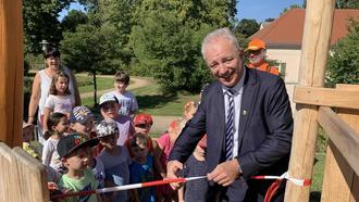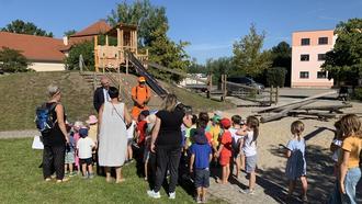 Auf dem Spielplatz Großdeuben in der Wiesenstraße gibt es etwas Neues zu bestaunen. Am 07.09.2023 wurde der neue Rutschenturm von Kindergartenkindern des „Kleine Hände“ e.V. und Bürgermeister Herrn Berndt eingeweiht. Die Erneuerung des Turmes war notwendig, da der alte Turm bereits 19 Jahre alte war und viel Reparaturbedarf hatte. Neben dem Turm wurden auch zwei Treppen aus Rundhölzern und eine Rampe mit einem Seil zum Hochziehen erneuert.