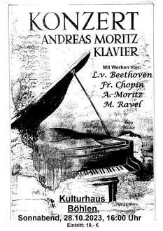 Am Sonntag, den 28.10.2023, 16:00 Uhr, wird im Böhlener Kulturhaus der Pianist und Chorleiter des Kammerchores Böhlen, Andreas Moritz, sein diesjähriges Konzertprogramm vorstellen. Es beinhaltet Werke aus vier Epochen und vier verschiedener Komponisten. Eröffnet wird das Konzert mit einem berühmten Werk von L. v. Beethoven: der 1801 geschriebenen „Mondscheinsonate“. Danach geht es weiter mit einer grandiosen Musik von Fr. Chopin – die Ballade in f- Moll Op. 52. Wie immer an dieser Stelle im Programm erklingt nun eine Komposition von A. Moritz: das „Klavierstück 2013“. Das insgesamt bewegte Stück vereinigt wilde Passagen mit ruhigen Elementen und endet mit besinnlicheren Klängen. Beim letzten Programmpunkt werden die Hörer nach Paris entführt. Von M. Ravel erklingt aus dem Zyklus „Gaspard de la nuit“ der erste Satz „Ondine“ und der letzte Satz „Scarbo“– ein imposantes und sehr impressionistisches Werk zum Schluss des Konzertes.