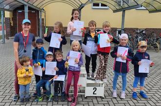 Im Training gekonnt über den Balken balancieren, die Stange hochklettern und im Handstand stehen – das können die Kinder der Sportgruppe „Zappelkäfer“ längst. Aber sind sie immer noch so cool, wenn sie im Wettkampf auf den Punkt die geforderte Übung zeigen sollen? Das durften die kleinen Sportler kürzlich beim Turntiger-Wettkampf in der Turnhalle der Oberschule Böhlen unter Beweis stellen. Vor Aufregung standen so ziemlich allen die Schweißperlen auf der Stirn. Schließlich galt es in Rekordgeschwindigkeit Hockwenden über die Bank zu absolvieren, mit Tauen von Bank zu Bank zu schwingen und vom hohen Kasten das Handstandabrollen zu meistern. So mancher ist unter den interessierten Augen der Eltern über sich selbst hinausgewachsen. Und alle haben gezeigt, dass sie auch unter Druck großartig turnen können. Als erfolgreichste Turntiger erwiesen sich Pauline Gläser, Ruby Richter und Lino Tirouche. Aber eines war allen Sportlern und Eltern beim anschließenden Picknick mit Siegerehrung klar: dieser Wettkampf kannte nur Gewinner. Herzlichen Glückwunsch und weiter so!