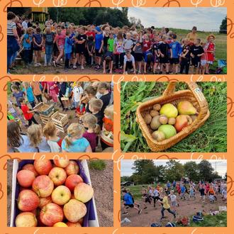 Höhepunkt des Tages war wie immer unser Erntedanklauf auf dem Sportplatz. Leider kann die Laufbahn nur noch eingeschränkt genutzt werden. So ist es anerkennenswert, dass alle Schüler unfallfrei ihr mitgebrachtes Körbchen mit Zwiebeln und Kartoffeln, mit Äpfeln, Birnen oder Nüssen füllen konnten.