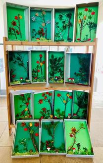 Im Mittelpunkt des Herbstprojektes in den LRS-Klassen stand der Apfel. Von der Blüte zur Frucht – jede Entwicklungsstufe wurde unter die Lupe genommen, ehe er genüsslich verspeist wurde. Die 4. Klasse griff das Sachunterrichtsthema Pflanzen des Waldes auf und gestaltete den Wald im Schuhkarton aus gesammelten Naturmaterialien.