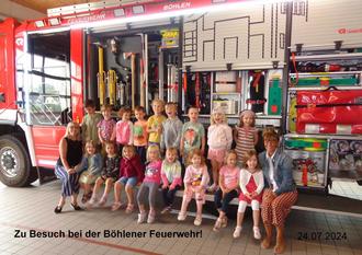 Als Höhepunkt war am 24.Juli 2024 ein Besuch bei der Freiwilligen Feuerwehr Böhlen geplant. Aufgeregt und neugierig machten wir uns auf den Weg zur Feuerwehr, wo wir schon von Katja und Stefan erwartet wurden. Staunend betraten wir das Feuerwehrgebäude und nahmen im großen Aufenthaltsraum der Feuerwehrleute Platz. Stefan erzählte uns viel über die wichtigen und interessanten Aufgaben der Feuerwehr. Katja hatte in der Zwischenzeit eine komplette Ausrüstung angezogen und jedes Detail daran wurde von uns genau unter die Lupe genommen. Dann ging es in die große Halle, wo sämtliche Feuerwehrautos auf ihren Einsatz warten. Stefan erklärte uns den Aufbau, die Ausstattung und Funktionen der Fahrzeuge. Alle Mutigen durften auch in die verschiedenen Feuerwehrautos klettern und dort Platz nehmen.