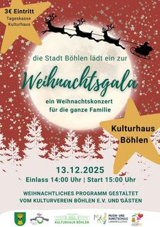 Am 13.12.2025 versetzt der Kulturverein Böhlen e.V. mit seinen Gästen uns alle wieder in puren Weihnachtszauber, denn es steht die Weihnachtsgala der Stadt Böhlen im Kulturhaus an. Das Konzert für die ganze Familie beginnt 15:00 Uhr, der Einlass ist ab 14:00 Uhr.