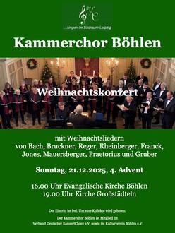 Mit einem stimmungsvollen Weihnachtskonzert lädt der Kammerchor Böhlen am Sonntag, den 21. Dezember 2025, Musikliebhaberinnen und Musikliebhaber zu zwei festlichen Aufführungen ein: