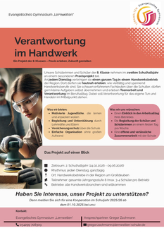 Mit dem Projekt „Verantwortung im Handwerk“ eröffnet das LERNWELTEN Gymnasium seinen Schülerinnen und Schülern der 8. Klassen einen besonders praxisnahen Zugang zur Arbeitswelt. Einmal wöchentlich arbeiten die Jugendlichen ein Schulhalbjahr lang in regionalen Handwerksbetrieben – etwa in Werkstätten, Bau- und Metallbetrieben, im Garten- und Landschaftsbau oder im Dienstleistungsbereich.