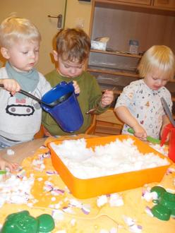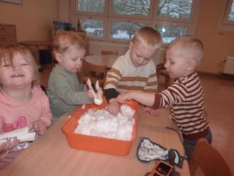 Rote Wangen, freudige Kinderaugen und ganz viel Spaß im Schnee. Natürlich darf da auch der Schneemann nicht fehlen. Die Igelkinder und Graßhüpfer der Kita „Böhlener Knirpse“ haben einen tollen Schneemann auf der Wiese vor der Kita gebaut. Der fröhliche Schneemann begrüßt nun jeden Tag die Kinder, Eltern und Erzieherinnen. Hoffentlich bleibt er uns noch ein paar Tage erhalten, bevor der Sonnenschein ihn zum Weinen bringt. Auch im Gruppenzimmer wurde mit Schnee experimentiert. Zwei Schalen voll Schnee wurden von den 1 bis 2-Jährigen Knirpsen begeistert erforscht. Mit Materialien wie Messbecher, Kuchenförmchen, Kellen und Löffel konnte die Feinmotorik trainiert werden. Auch Plastikmesser kamen zum Einsatz, um spielerisch das Schneiden am Schneekuchen zu üben.