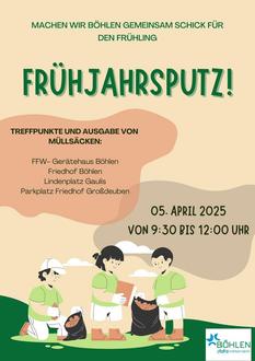 Helfen Sie am 05. April 2025 mit, Böhlen, Großdeuben und Gaulis schick für den Frühling zu machen. In der Zeit von 9:30 Uhr bis 12:00 Uhr werden wie jedes Jahr an den üblichen Sammelstellen Müllsäcke und Handschuhe ausgegeben, um unsere Natur vom Müll zu befreien. Außerdem wird der Bauhof an diesen vier Sammelstellen den gefundenen Unrat einsammeln.