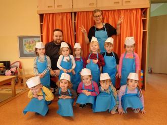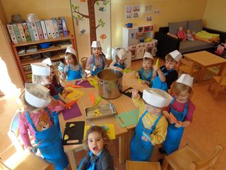 Gerade in der heutigen Zeit ist gesunde Ernährung ein wichtiges Thema und genau aus diesem Grund starteten wir am 11. Februar 2026 unser Projekt „Kartoffel, Karotte und Co“. Alles begann mit einer lustigen Geschichte, die uns erzählte, wie Kartoffeln wachsen, gedeihen und wozu sie in unserer Esskultur bestimmt sind. Mit den passenden Utensilien spielten wir die Geschichte nach, prägten uns diese durch Wiederholungen ein und erweiterten gleichzeitig unseren Wortschatz. In einem Fingerspiel erfuhren wir die wesentlichen Schritte beim Suppe kochen und verbesserten nebenbei auch unsere Feinmotorik. Natürlich durfte die Kreativität nicht fehlen und so gestalteten wir mit Buntpapier, Schere und Leim ein tolles Gemeinschaftsbild auf dem alle Zutaten für eine leckere Kartoffelsuppe zu finden sind. Ein lustiger Gemüse-Rap förderte unsere Sprachmotorik und dieser flotte Vers machte eine Menge Spaß. Der krönende Abschluss fand dann am 25.Februar statt. Wir kochten gemeinsam mit Charly, einem Mitarbeiter vom GFB unserem Essensanbieter und mit Gritt eine leckere Kartoffelsuppe. Charly brachte alles mit. Vom Topf, den Schneideutensilien, sogar eine Kochplatte hatte er dabei, bis hin zu allen Zutaten die eine Kartoffelsuppe braucht. Nichts hat gefehlt. Natürlich brauchten kleine Starköche auch Kochschürzen und Kochmützen. Die bekamen wir auch noch von ihm und durften sie sogar mit nach Hause nehmen. Ausgerüstet mit kindgerechtem Schneidewerkzeug legten wir mit viel Spaß los. Von der Kartoffel, Möhre, Zwiebel, Sellerie und Lauch, alles wurde von uns in kleine Stücke geschnitten und ab ging es in den großen Kochtopf. Nach getaner Arbeit gab es eine gesunde Belohnung. Charly brachte uns Ananas, Honigmelone, Birnen und Pomelos mit und das leckere Obst verspeisten wir mit großem Appetit. Das Kochen im großen Topf übernahm dann Carly, aber der Duft stieg uns allen in die Nase und weckte unseren Hunger. Und genau zu unserer Mittagszeit konnten wir gemeinsam unsere selbst zubereitete Kartoffelsuppe mit Wiener Würstchen verspeisen. Das haben wir richtig gut hinbekommen. Wir möchten uns auf diesem Wege ganz herzlich beim GFB, insbesondere bei Charly bedanken. Wir haben sehr viel gelernt, wir hatten ganz viel Spaß und geschmeckt hat es sowieso.