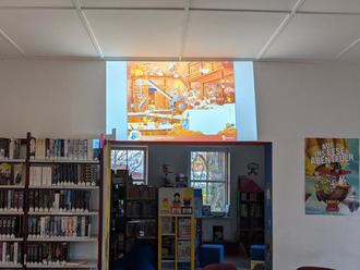 Am 15.03. folgte dann ein Bilderbuch-Kino. Auf Voranmeldung durfte die Bibliothek viele Kinder und ihre Eltern willkommen heißen. Etwas abgedunkelt, in gemütlicher Atmosphäre konnten die Kinder zwei kleinen Geschichten lauschen. Dabei wurden mit einem Beamer Bilder an die Wand geworfen – wie im Kino eben. Die erste Geschichte handelte von Hase Häppi, der gar nicht froh ist, dass er jeden Tag Entscheidungen treffen muss. Anhand seines Kleiderschrankes und mit Hilfe einer verrückten Drehscheibe, sollen ihm die Farben in seinem Kleiderschrank die Entscheidungen abnehmen. Aber schnell stellt er fest, dass ihn eigentlich nur ein kunterbuntes Leben glücklich macht.