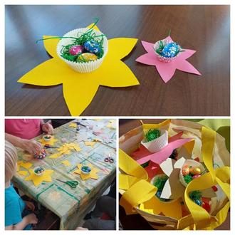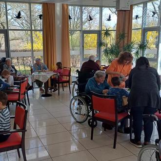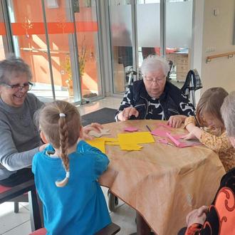 Die Aufgabe für alle: gemeinsam Osterglocken basteln, die man dann mit Leckereien und Überraschungen füllen kann. Sobald die Kinder ihre Plätze an den Tischen der Senioren gefunden hatten, begannen angeregt die Gespräche zwischen Groß & Klein - oder besser: Alt & Jung. Und natürlich haben sich alle gegenseitig geholfen - beim Bemalen der Schablonen, beim Ausschneiden oder beim Kleben. Dabei strahlten bei allen die Augen und alle hatten viel Spaß. Es wurde auch heimlich das ein oder andere Schokoladenei genascht – nicht nur von den Kindern. Am Ende schenkten die Bewohnerinnen und Bewohner des Seniorenheims den Kindern ihre gebastelten Blumen, damit sie ihren Geschwistern und Eltern auch etwas mitbringen konnten. Alle waren sich einig, dass es ein sehr schöner Vormittag war, der bald wiederholt werden sollte. Das nächste Fest kommt bestimmt bald. Das Team des Seniorenheims „Am Park“ bedankt sich ganz herzlich beim Kita-Team und natürlich ganz besonders bei den kleinen „Böhlener Knirpsen“ für den Besuch und das schöne Miteinander.