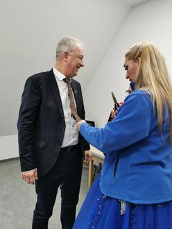 Das Faschingswochenende wurde wieder einmal mit dem Besuch der Damen des Röthaer Karnevalsverein eingeläutet. Am 27.02.2024 ging es unseren Männern aus dem Rathaus an die Krawatte. Um durch das Abschneiden der Krawatten symbolisch das Regiment im Rathaus zu übernehmen, setzte die Prinzessin der 62. Session bei allen anwesenden Männern der Stadtverwaltung kurzerhand die Schere an. Es folgte ein Küsschen auf die Wange - so will es der Brauch. Danach ging es zum gemütlichen Teil über. Bei Kaffee, Gebäck und dem ein oder anderen Glas Sekt feierten die Damen des KCR zusammen mit Bürgermeister Herrn Berndt den „kleinen Überfall“.