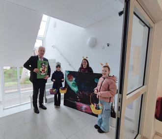 Pünktlich vor Ostern fand sich der Hort „Pfiffikus“ im Rathaus der Stadt Böhlen ein, um unserem Bürgermeister Dietmar Berndt und den Mitarbeiterinnen und Mitarbeitern der Stadtverwaltung Böhlen einen Ostergruß zu überbringen. Neben liebevoll gebastelten Osterhäschen für alle und einer Osterkarte im Großformat bekam unser Bürgermeister ein kunstvoll gestaltetes Bild für den Neubau des Rathauses überreicht. Wir haben uns sehr über den Ostergruß gefreut und möchten uns alle noch einmal ganz herzlich beim Kinderhort „Pfiffikus“ bedanken.