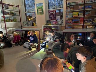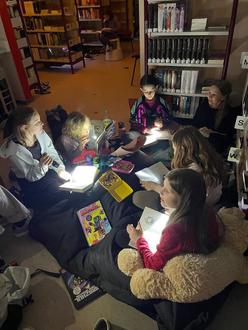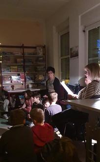 Es wurden die Kinder der 4. Klasse der Grundschule "Pfiffikus" zu einer Taschenlampenlesung eingeladen. 20 Uhr kamen alle sehr aufgeregt in die Bibliothek. Zuerst suchten die Kinder eine ruhige Ecke zum Lesen, dazu brachten sie Sitzkissen, Kuschelkissen und sogar Campingstühle mit. Frau Adam und Frau Kannecht sorgten für eine gemütliche Atmosphäre. Mit einer Gruselgeschichte "Das Spukhaus", die von Frau Kannecht vorgelesen wurde, begann dieser Abend.