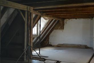 Die Restaurierungsmaßnahmen im Altbau des Rathauses schreiten ebenfalls mit großen Schritten voran. Die Entkernungsarbeiten sind beendet. Aktuell finden noch Arbeiten an den Rohrinstallationen im Bereich Heizung/ Sanitär und Elektro statt. Zukünftig wird es noch Holzschutzarbeiten geben und die Unterspannbahn muss in einem begrenzten Bereich repariert bzw. erneuert werden. Dazu werden Dachdeckerarbeiten von Nöten sein.