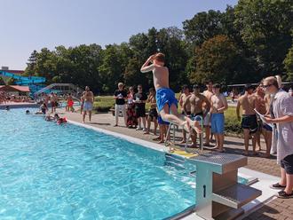 Weiter ging es mit dem Arschbombenwettbewerb. Da an diesem Tag bestes Badewetter war, fiel der Sprung ins kühle Nass nicht schwer. Und so wurde die Jury, bestehend aus Bürgermeister Herrn Berndt, Sarah Maas (Mitglied KGV „Am Streitteich“ e.V.) und Freibadmitarbeiter Herrn Thiele, ordentlich nass gespritzt.