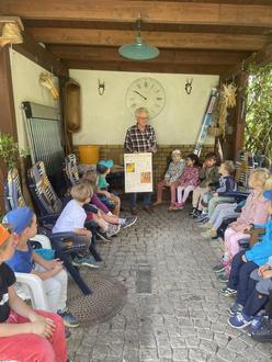 Der Weg war schon weit, als wir bis in die Mitte der Straße des Friedens gelaufen sind, um einen echten Imker bei der Arbeit zu sehen und viel Interessantes über die Bienen und den Honig zu erfahren. Zu Beginn erklärte uns Herr Tonne alles Wichtige über die Bienen und die Herstellung des leckeren Honigs. Dann durften wir eine echte Imkerjacke, den Imkerhelm und Handschuhe anprobieren. Wir sahen sehr lustig aus. Nun hat uns Herr Tonne den Bienenstock gezeigt mit den vielen summenden Bienen. Wir haben hinten hineingeschaut, aber die Bienenkönigin konnten wir nicht entdecken - schade. Im Keller seines Hauses hat er eine richtige Honigküche. Herr Tonne hat uns genau gezeigt, wie er den Honig aus der Wabe herausbekommt. Das war sehr spannend. Aus der Honigschleuder kam dann der goldene Honig herausgelaufen. Lecker!! Zum Schluss bekamen wir alle ein Glas Honig zum Mitnehmen.