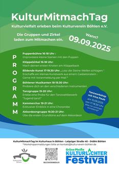Der KulturMitmachTag findet im Rahmen des Kulturlichter-Festivals der Grünen Pleiße statt. Wir möchten uns an dieser Stelle beim Kulturhaus Böhlen, das diesen Tag sowie die Auftaktveranstaltung „Let’s Dance – Gut BeHütet“ am 23. August möglich macht, für die große Unterstützung bedanken. Wir freuen uns, den Tag mit euch zu verbringen und euch unsere Gruppen und Zirkel vorzustellen.