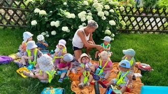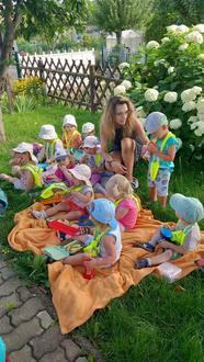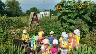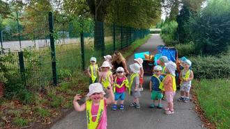 Gut gelaunt, die kleinen Rucksäcke gefüllt mit Snacks und Getränken, starteten wir am 10. Juli zu unserem ersten Wandertag. Die Sonne schien und auch das ein oder andere lustige Liedchen begleitete uns auf unserem Weg. Ziel war der Begegnungsgarten in der Böhlener Gartenanlage. Da wir ja noch kurze Beinchen haben, konnten wir die erste Strecke gemütlich in unseren Krippenwagen genießen. Das fanden wir natürlich toll, denn schon lange haben wir nicht mehr darin gesessen. Was für ein Spaß. Es ging durch den Park, vorbei an der Feuerwehr. Natürlich wurden die großen Autos gleich noch mit bestaunt und unser Lied von der Feuerwehr durfte auch nicht fehlen. Am Ziel angekommen, kletterten wir aus unseren Wagen und konnten es uns sogleich auf den großen mitgebrachten Decken gemütlich machen. Die Rucksäcke mit den verschiedensten Leckereien, von Obst/ Gemüse, Keksen und auch kleinen Würstchen sowie Getränken kamen zum Vorschein. Wir wussten garnicht, was wir zuerst probieren sollten und so haben wir alle toll geteilt und jeder konnte auch mal von dem anderen naschen. Als wir alle gesättigt waren und auch die Bienen merkten, oh gibt es leckere Sachen, packten wir alles wieder in unsere Rucksäcke und machten einen kleinen Rundgang durch den Begegnungsgarten. Was es da alles zu bestaunen gab. Riesengroße Sonnenblumen, Obstbäume, Tomatenpflanzen, ein Insektenhaus, eine kleine gemütliche Sitzecke mit Bänken und vieles mehr. Dann stand auch schon der weite Rückweg an, aber dieses Mal hieß es... Laufen!!! Justine und Gritt schoben unsere Wagen, in denen sich jetzt nur die Rücksäcke befanden und wir konnten durch den Park flitzen. Das war klasse. Als wir nicht mehr weit vom Kindergarten entfernt waren, bemerkten wir allerdings, dass der Himmel ganz dunkel wurde und so beeilten wir uns, um noch trockenen Fußes wieder anzukommen. Das haben wir auch glücklicherweise geschafft, denn kurze Zeit später öffneten sich die Schleusen. Nun waren wir aber auch ganz schön knülle und der Mittagsschlaf ließ nicht mehr lange auf sich warten. Es war ein schöner Vomittag, den wir bestimmt wiederholen werden.