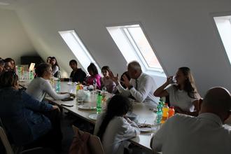 Danach ging es wieder zum Rathaus, wo schon Pizza und Bagels warteten. Nebenbei wurden auch Erfahrungen und Eindrücke mit dem Bürgermeister ausgetauscht. Dabei betonten die Schülerinnen und Schüler, wie sehr sie diese Konzerterfahrung geschätzt haben und wie herzlich sie den Empfang hier in Böhlen fanden. Diese Worte hört man gerne! Und auch Herr Berndt nutzte nochmal im Gespräch mit den Jugendlichen die Gelegenheit zu betonen, wie besonders er dieses Wochenende fand und dass diese gesammelten Eindrücke lange in seinem Gedächtnis bleiben werden. Wir alle waren uns einig, dass dies nicht der letzte Austausch bleiben soll.