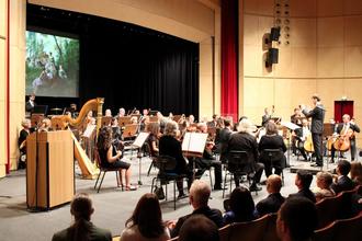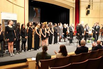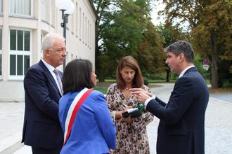 Nachdem die Proben beendet waren, ging es für unseren französischen Besuch zunächst zurück ins Hotel. Kräfte sammeln, Bühnenoutfit anziehen. Ab 16:30 Uhr wartete das Festprogramm auf alle geladenen Gäste. Zunächst wurde der neue Festplatz vor dem Kulturhaus Böhlen feierlich als „Vaulx-en-Velin-Platz“ eingeweiht. Im Beisein des Landrates Herrn Graichen, der Geschäftsführerin der Kulturbetriebs GmbH, Frau Fuhrmann, dem Geschäftsführer der Leipziger Symphonieorchester gGmbH, Herrn Palkó, Mitglieder des Orchestervorstandes des LSO und einigen Stadträtinnen und Stadträten, enthüllten die beiden Bürgermeister die Stele, welche nun den Namen dieses Platzes präsentiert. Im Anschluss daran wartete auf alle Gäste ein Abendessen im Kleinen Saal des Kulturhauses. Nachdem sich alle für das Festkonzert gestärkt hatten, wechselten wir in den Großen Saal. Zum Festkonzert waren einige weitere geladenen Gäste sowie viele Bürgerinnen und Bürger anwesend. Durch das Konzert des Leipziger Symphonieorchesters zusammen mit den französischen Musikschülern führte der italienische Dirigent Daniele Pilato.