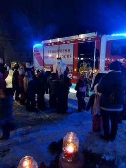 Um 16.00 Uhr wurde der Adventsmarkt offiziell durch einen Posaunenchor eröffnet. Zu unserem Glück, kreuzten an diesem Tag auch die Weihnachtsfeuerwehren die Kringelsdorfer Straßen, sodass sich Jung und Alt am Wegesrand einfanden, um die ehrenamtlichen Fahrerinnen und Fahrer der bunt beleuchteten Fahrzeuge zu grüßen.