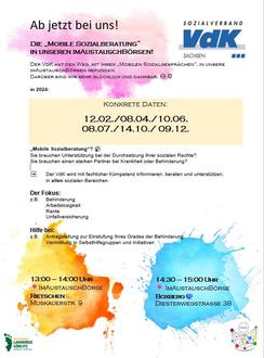 Wir freuen uns sehr, dass dank dem VdK und der "Mobilen Sozialberatung" wir Euch noch ein weiteres Angebot kostenlos und ganz nah anbieten können.