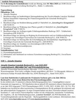 | 6. | Beschlussvorlage zur beabsichtigten Satzungsänderung des Zweckverbandes Lausitzer Seenland Sachsen hinsichtlich Anpassung des Finanzierungsanteils der Gemeinde Boxberg/O.L. |