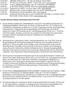 | • | Das Integrierten Gemeindeentwicklungskonzept für die Gemeinde Boxberg/O.L. befindet sich derzeit in der finalen Abstimmung. Hierzu wird es am 20.03.2025 eine verwaltungsinterne Runde geben, um insbesondere die in den letzten Workshops vorgeschlagenen Maßnahmen zu konkretisieren, bevor das Konzept zum Beschluss im Gemeinderat vorgestellt wird. Das Vorhaben wird nach der Richtlinie des Sächsischen Staatsministerium für Regionalentwicklung zur Umsetzung von LEADER-Entwicklungsstrategien (Förderrichtlinie LEADER-RL LEADER/2023) gefördert. |
