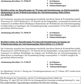 Der Technische Ausschuss des Gemeinderates beschließt, dem Bieter Mucke & Weinhold Bau GmbH, Wiesenweg 423, 02943 Boxberg/O.L. OT Kaschel mit der fachgemäßen, vorsaisonalen Kontrolle und Austausch von defekten Holzverbindungen/ Rammschutz am Wellenbrecher der Schwimmsteganlage im Hafen Klitten zu beauftragen. Der Gesamtbetrag beträgt voraussichtlich 10.782,50 € zuzüglich der gesetzlichen Mehrwertsteuer.