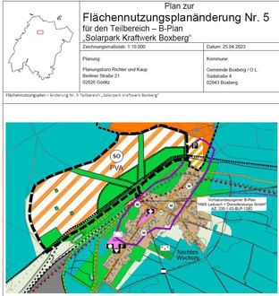 Der Gemeinderat der Gemeinde Boxberg/O.L. hat am 08.05.2023 in öffentlicher Sitzung den Feststellungsbeschluss der 5. Änderung des Flächennutzungsplans (FNP) der Gemeinde Boxberg/O.L. für die Teilfläche „Solarpark Kraftwerk Boxberg“ - in der Fassung vom 25.04.2023 gefasst und die Begründung gebilligt.