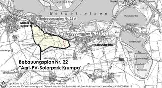 Der Stadtrat der Stadt Braunsbedra hat mit Beschluss vom 29.11.2023 die Zusammenführung der mit Aufstellungsbeschluss vom 30.11.2022 beschlossenen Verfahren zu den Bebauungsplänen Nr. 22.1 "Agri-PV-Solarpark Krumpa, Teilplan Nord" und Nr. 22.2 "Agri-PV Solarpark Krumpa, Teilplan Süd" der Stadt Braunsbedra zum Bebauungsplan Nr. 22 "Agri-PV-Solarpark Krumpa" beschlossen und den daraus resultierenden Plangeltungsbereich des Bebauungsplanes gebilligt.
