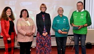 LSB Vorstand Ines Kramer, KSB Präsidentin Angela Heimbach, Vertreterin Landrat Saalekreis Annett Hellwig, Peter Bößler, Gerald Grube (v. l. auf Kubak-Foto)