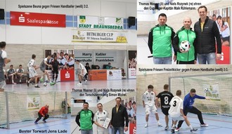 musste der Sieger im Elfmeterschießen ermittelt werden. Aber erst stand noch das letzte Spiel zwischen den Handballer und Blösien an, welches die Handballer mit 4:3 gewinnen konnten. Damit konnten die Handballer den 3. Platz erreichen. Es folgte das Elfmeterschießen. Den entscheidenden Treffer konnte Steffen Holzapfel verwandelten und bescherten den Fußballern den Cup. Als bester Torhüter wurde vom Friesen-Vorsitzenden Thomas Wasner sowie Niels Rozynek, Gebietsverkaufsleiter der Bitburger Braugruppe, der Beunaer Jens Lade geehrt. Die Auszeichnung zum besten Torschützen erhielt Simon Michel vom SV Friesen Handball.