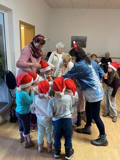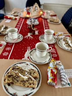 Seit Jahren gestalten sie für uns ein wunderschönes Weihnachtsprogramm. Dafür gebührt ihnen und ihren Erzieherinnen unser herzlicher Dank. Im Anschluss gab es, wie zu Weihnachten üblich, Kaffee, Stollen und Kräppelchen. Natürlich gehört zu Weihnachten auch eine Bescherung.
