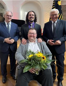 Der Chorleiter des Bergmannschors Geiseltal e.V. Ilja Scherdin wurde am 27.08.2024 mit dem Bundesverdienstkreuz am Bande ausgezeichnet. Bundespräsident Frank-Walter Steinmeier und Ministerpräsident Reiner Haseloff würdigten damit sein großes Engagement in vielen Ehrenämtern gleichzeitig. Einmal für die Integrationshilfe für Flüchtlinge, die so leichter in der Gesellschaft Fuß fassen können (wie z.B. Behördengänge, Deutschnachhilfe, etc). Aber auch sein voller Elan bei der Chorleitung des Bergmannschores Geiseltal e.V. wurde geehrt.