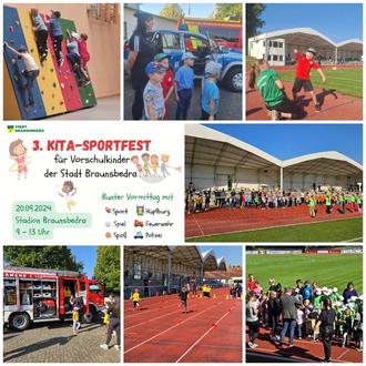 Am Freitag, den 20.09. hieß es zum 3.Mal,,Sport frei!‘‘ für alle Vorschulkinder im Stadion der Stadt Braunsbedra. Pünktlich 9.00 Uhr begrüßte Herr Schmitz alle Kinder, Erzieher und Helfer. Zur Erwärmung heizte uns das Zumba-Team der Lessing-Grundschule kräftig ein. Anschließend absolvierten alle Kinder die Stationen im Weitsprung, Weitwurf, 30-m und 400-m-Lauf. Am Ende traten alle Kita’s beim Staffellauf gegeneinander an. Danke Herr Rosenbaum für die Bereitstellung der Materialien dafür.