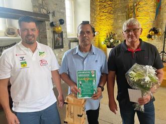 Neben den vielen Gratulanten gab es auch Glückwünsche und Dankesworte vom Franklebener Ortsbürgermeister Günter Küster (rechts) und natürlich auch vom Vorsitzenden Thomas Wasner (links).