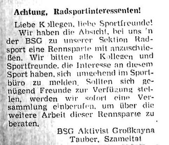 Aufruf 1954 im "Aufwärts" zur bildung einer Radrennsparte in der BSG Aktivist Großkayna