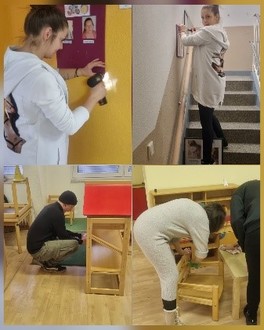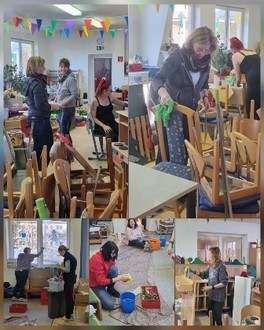 So haben uns unsere Eltern Anfang Dezember 2024 unwahrscheinlich geholfen. Der erste Bereich war fertig. Nun hieß es, Spielzeug und Möbel reinigen, Bilder, Informationstafeln anschrauben, Schränke wieder einräumen. Alles musste so hergerichtet werden, dass die Kinder der vier Krippengruppen alle am nächsten Tag in die obere Etage ziehen konnten.