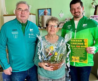 Am 25.02.24 feierte unser Ehrenmitglied Karla Müller ein besonderes Ereignis. Da ließen sich der alte und neue Vereinsvorsitzende nicht bitten und brachten ein Geschenk bei Ihr zuhause vorbei. Bei einer Tasse Kaffee und schöner Apfeltorte schwelgte man mit der ehemaligen Schuldirektorin in Erinnerungen und unterhielt sich sehr gut. Auch Sie in ihrem Alter ist in der Gemeinschaft noch aktiv und trifft sich 1mal im Monat mit ihrer Singegruppe im Bürgerbüro. Sportlich hält sie sich in der Turngruppe fit. Nur mit dem Zumba wird es seit kurzer Zeit nichts mehr. Sport frei!