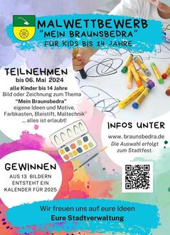 Male uns ein Bild (A4 Größe, Querformat) von Braunsbedra und reiche es bis zum 06. Mai 2024 an die Stadtverwaltung Braunsbedra, Markt 1 ein, vermerke deinen Namen sowie Anschrift und Alter.