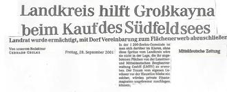 Das Tagebau-Restloch Kayna-Süd bzw. der Südfeldsee befand sich bis zum Jahr 2001 im Eigentum der LMBV. Allerdings bemühte sich die Gemeinde Großkayna schon längere Jahre, den See in ihren Besitz zu bekommen. Den Volksvertretern war klar, dass die sich entwickelnden Pläne zur Gestaltung des Sees nur durchgesetzt werden können, wenn die unmittelbare Mitsprache der Gemeinde gesichert ist. Der ehemalige Tagebau sollte nicht mit seinen negativen Auswirkungen in Form von Staub und Dreck in der Erinnerung der Bürger bleiben, sondern sie wollten unmittelbar an der nun entstehenden Seenlandschaft in angemessener Form teilhaben. Um den Kauf des Sees in Angriff nehmen zu können, wurde die Unterstützung des Landkreises auch in finanzieller Hinsicht benötigt.