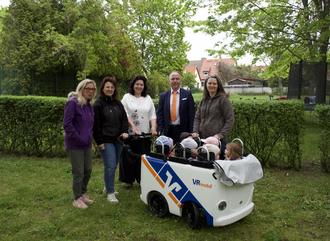 Freudig und dankbar nahm Frau Görlitz, die Leiterin unserer Kita, das Gefährt in Empfang und die Kinder durften gleich eine Runde mitfahren. Das Kindermobil bietet bis zu 6 kleinen Fahrgästen Platz und dank eines Sonnen- bzw. Regendachs können wir selbst bei schlechtem Wetter Spaziergänge machen.