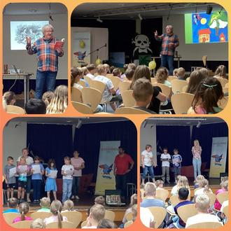 Kurz vor den Sommerferien gab es für alle Kinder der Lessing-Grundschule Braunsbedra eine besondere Überraschung - Süßes und Saures! Autor Frank Kreisler stellte seine Gespensterlachgeschichten „Bücherdieb im „Süßen Drops““ und „Gespensterbowling auf dem Galgenberg“ vor. Dabei ging es um Spukabenteuer mit (Geister)kindern und mysteriöse Ereignisse im Süßwarenladen. Beide Bücher sind bei uns ausleihbar.