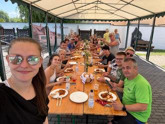 Mit der Vorführung der FFW Braunsbedra wurde, im wahrsten Sinne des Wortes, ein weiteres Highlight geschaffen. Die Drehleiter bot für Mutige einen Rundum-Blick über Reip’sch aus einer Höhe von 32 Metern. Auch hier nochmal herzlichen Dank an alle Kameraden. Für uns Vereinsmitglieder begann jetzt die (fast) letzte Herausforderung des Wochenendes, nämlich die Gästeversorgung am Hauptfesttag. Alle Mitglieder waren hochmotiviert. Sowohl die Grillbrigade, die Fischbrötchen-Frauen, das Thekenteam, die Cocktail-Girls als auch die Damen und Herren des „Rückwärtigen Dienstes“ einschließlich der Tombola-Glücks-Fee standen in Bereitschaft. Die grandiose Showeinlage des Männerballetts des „1. Schkortlebener Traditionsclubs e.V.“ verpasste somit ein Großteil von uns „Eingeteilten“. Nach einer recht kurzen Nacht machten wir uns am Sonntagmorgen ans Ausräumen, Aufräumen, Rückbauen und Wegstauen. Das positive Feedback einiger Spaziergänger zum Heimatfest und auch zum Band II unseres „Zickenbuches“ ließ uns sogar die Rückenschmerzen und den Muskelkater (kurzzeitig) vergessen. Ein Braten aus unserem Backofen auf dem Dorfplatz war dann gegen 13:00 Uhr unser Mittagessen. Jetzt kehrte endlich mal etwas Ruhe ein.