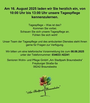 Am 28. Juni öffnete die Senioren Wohn- und Pflege GmbH am Stadtpark Braunsbedra seine Türen für Besucher, Angehörige, Interessierte und natürlich die Bewohnerinnen und Bewohner selbst. Bei herrlichem Sommerwetter erwarteten die Gäste ein buntes Programm voller Musik, Genuss und Unterhaltung.