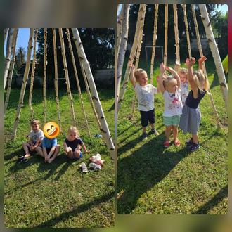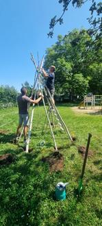 Wir suchten uns einen geeigneten Platz auf unserer Wiese, um unser Vorhaben zu verwirklichen. Durch die tatkräftige Unterstützung der Fam. Standke und Holuszek entstand für unsere Kinder ein riesiges Tipi. Dieses wird mit großer Begeisterung nun genutzt.